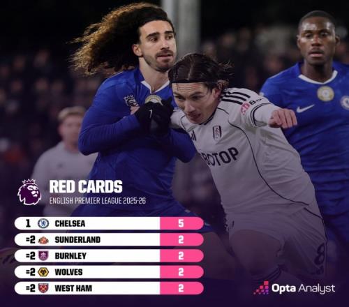 队史单赛季英超纪录6红!切尔西本赛季已5红,同期其他队最多2红