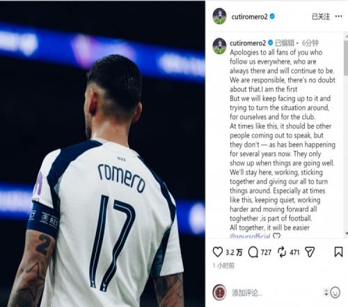 罗梅罗社媒:向所有追随我们的球迷致歉有些人只在顺境时发声
