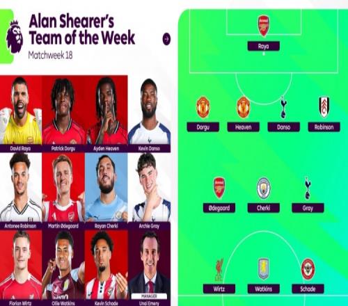 希勒评英超第18轮最佳阵:拉亚、维尔茨、厄德高、谢尔基在列