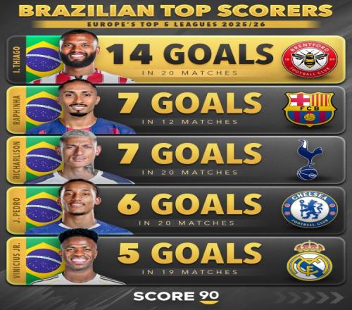 体育播报1月5日宣 Score90统计了本赛季巴西球员在五大联赛的进球数量,并列出榜单,伊戈尔·蒂亚戈14球断层居首...