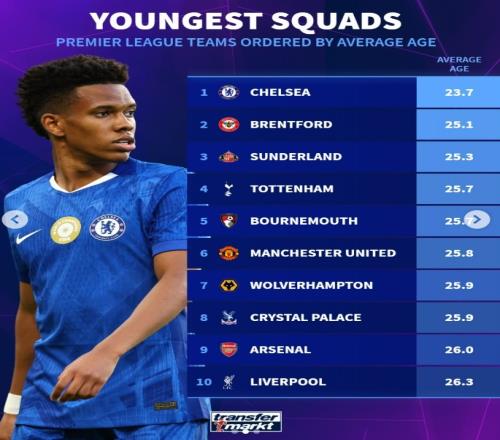 本赛季英超平均年龄最低球队:蓝军23.7岁居首,曼联第6,枪手第9