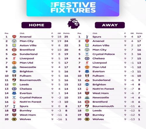 本赛季英超主客场积分榜:阿森纳主场25分最多、客场17分并列最多