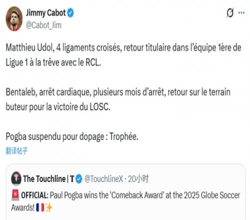 体育播报12月29日宣 博格巴昨日获得环足奖最佳复出奖。前法甲球员吉米·卡博特在社媒上转发了博格巴获奖的...