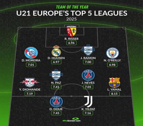 whoscored年度U21最佳阵亚马尔、杜埃领衔伊尔迪兹、赫伊森在列