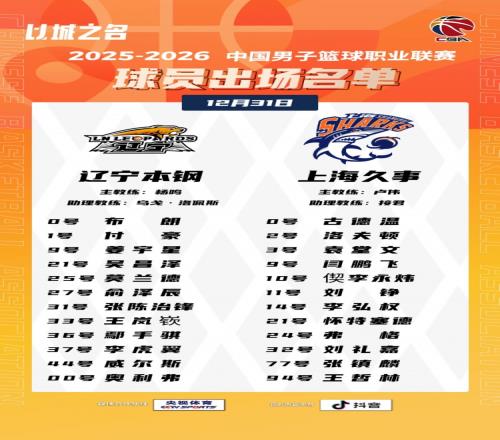 体育播报12月31日宣 今晚19:35,辽宁主场迎战上海。赛前双方公布了本场大名单。辽宁:布朗、付豪、姜宇星、吴昌...