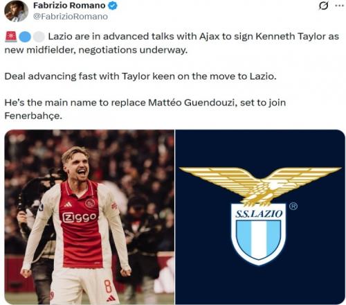 罗马诺:拉齐奥就引进泰勒与阿贾克斯达成协议,转会费1500万欧