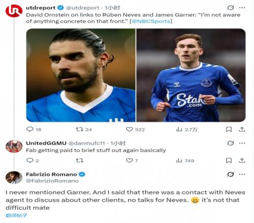体育播报12月27日宣 知名记者罗马诺社媒澄清,他并没有说过曼联与加纳或鲁本·内维斯谈判。NBC记者奥恩斯坦在...