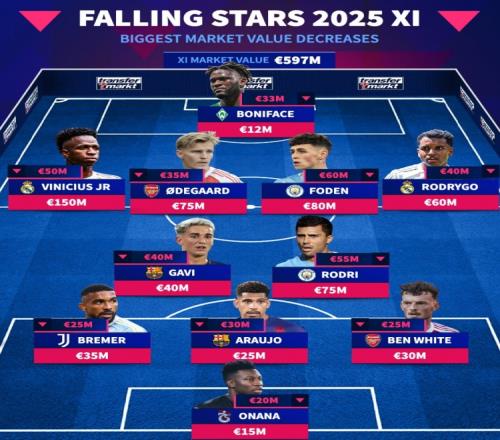 2025身价下跌最多阵:维尼修斯、罗德里领衔,厄德高、阿劳霍在列