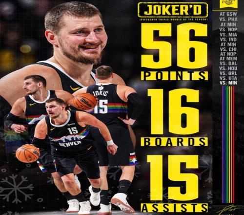 掘金官方晒约基奇56分三双海报:有史以来圣诞大战的最佳表现