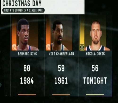 约基奇爆砍NBA圣诞大战历史第三高的56分仅次伯纳德金和张伯伦