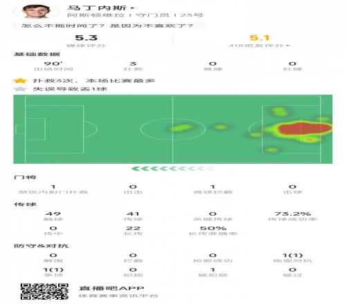 大马丁数据:3次扑救丢4球,1次失误导致丢球,评分5.3全场最低
