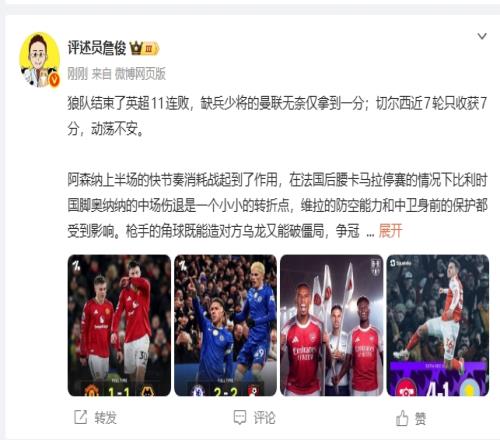体育播报12月31日宣 本轮英超,曼联1-1狼队,阿森纳4-1击败维拉,切尔西2-2伯恩茅斯,赛后评述员詹俊发文。詹俊:狼队...