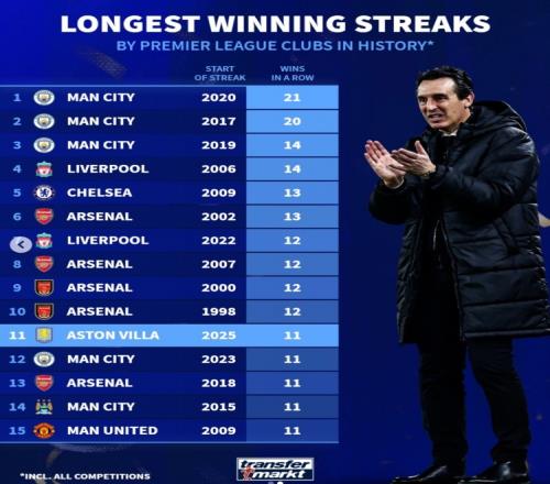 英超球队历史各项赛事最长连胜榜:曼城21场居首,维拉当前11连胜