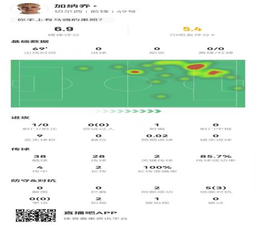 加纳乔本场1射0正+2关键传球2抢断2犯规+5对抗3成功获评6.9分