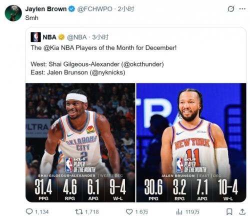 被大头力压抢走月最佳!杰伦布朗亲自发推:不理解