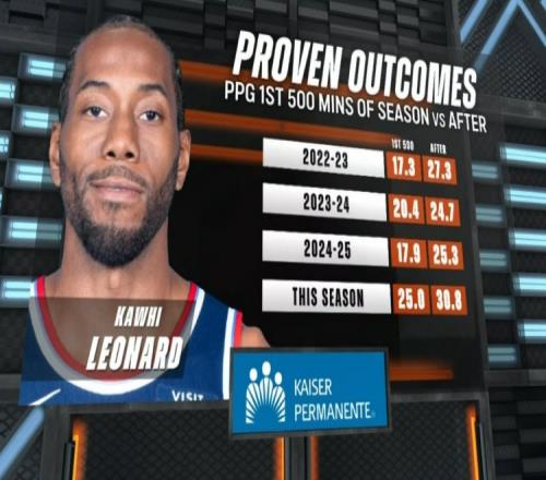 莱昂纳德近四个赛季赛季500分钟之前和之后场均得分对比:22-23赛季:17.3分VS27.3分23-24赛季:20.4分VS24.7分24-...