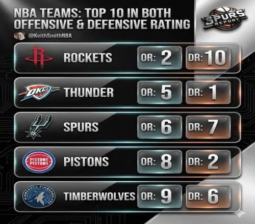 赛季至今攻防效率值均前10球队:火箭、雷霆、马刺、活塞、森林狼
