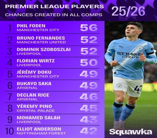 英超球员本赛季各赛事创造机会排名:福登56次居首利物浦3人上榜