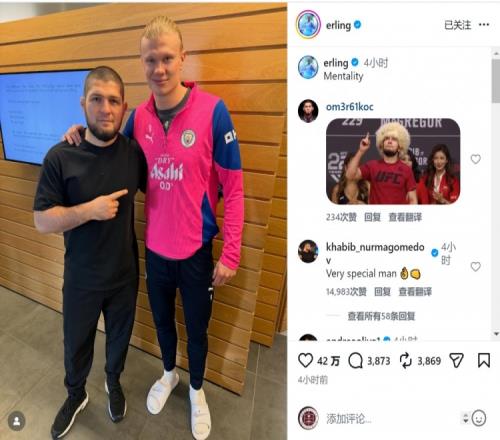 体育播报1月7日宣 曼城前锋哈兰德更新社媒动态,晒出与UFC传奇选手小鹰(哈比卜·努尔马戈梅多夫)的合照。两人身...
