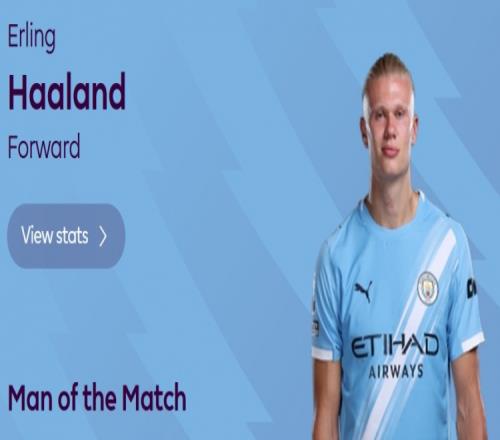 点射破门,英超官方:哈兰德当选曼城11布莱顿全场最佳球员