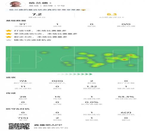 点射破门!哈兰德数据:7次射门4次射正,错失1次机会,获评7.2分
